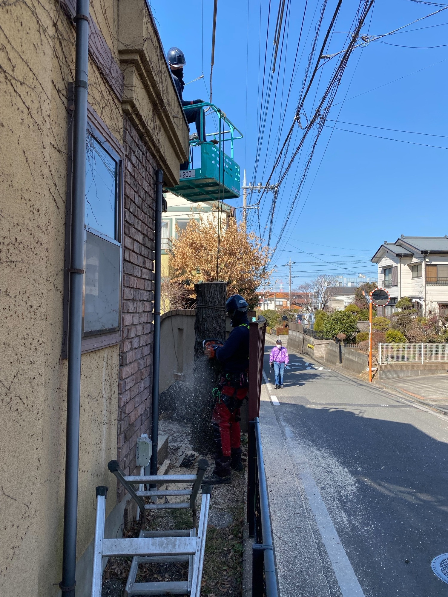 道路幅員も狭いので作業がやりずらいかも…と思いきや、S様のお気遣いで高所作業車を上手くセットし事故等も一切なく無事に作業が完了致しました😊