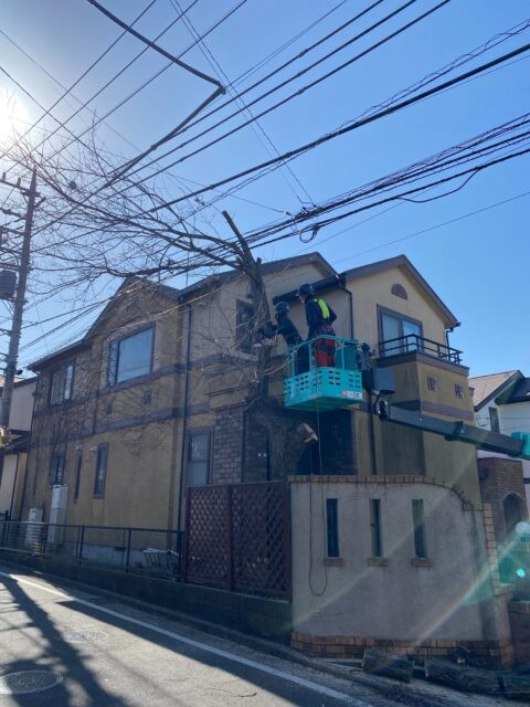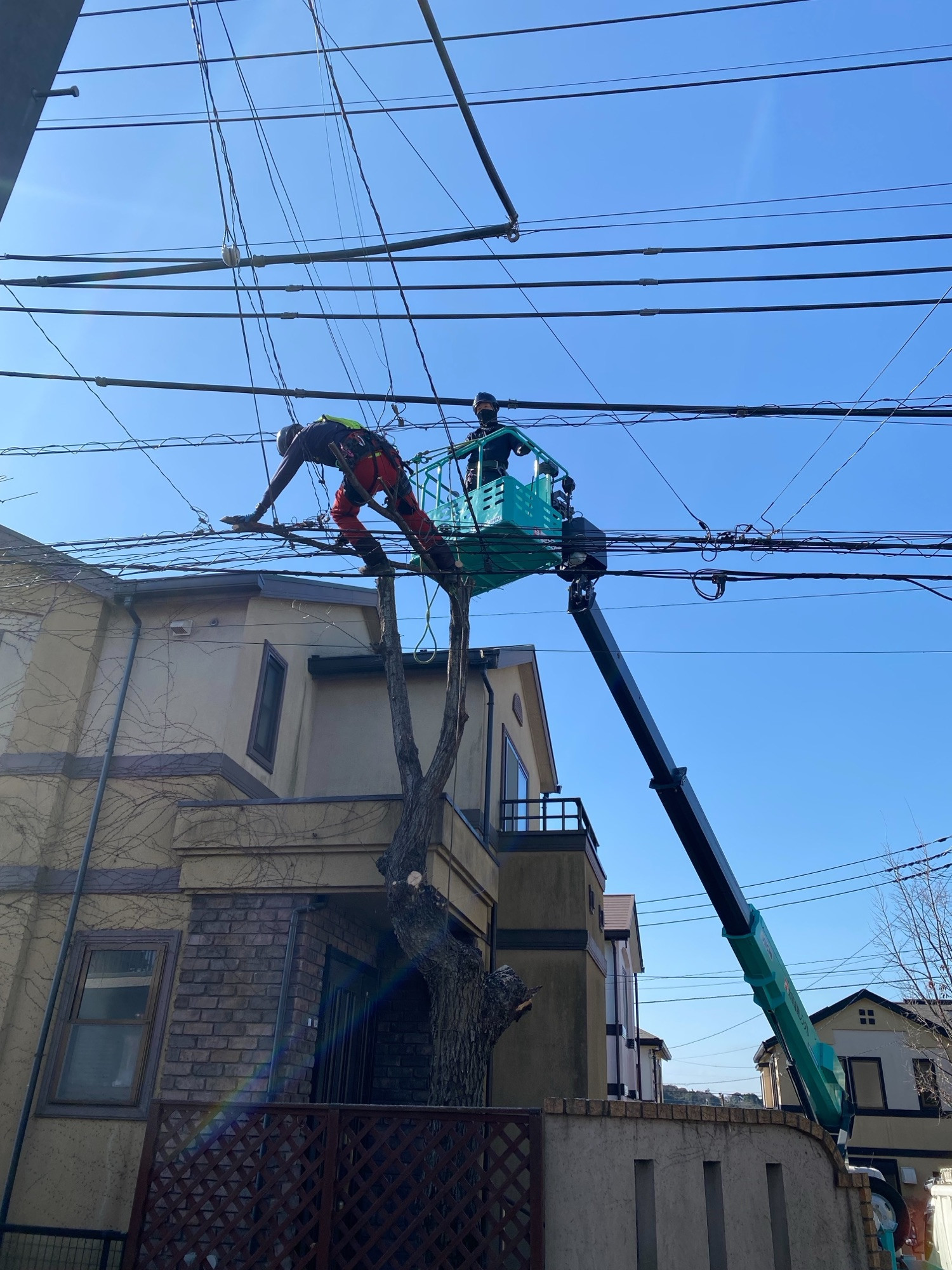 電線に深く絡み込んだ枝先がとても怖く、慎重に作業を進めました…