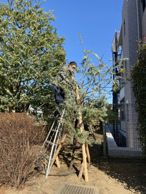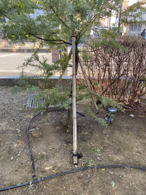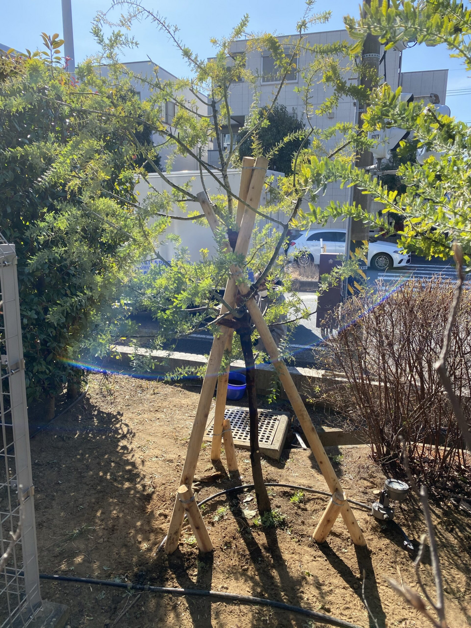八ツ掛け支柱(^^)/ 2023.01.26| お知らせ 株式会社 角安です今回は支柱設置作業です😊連日の強風の影響でミモザが傾いてしまったようですね…その修復をさせて頂きます🌲年間管理をさせて頂いております地元のマンション様での作業になります✨木村君と一緒に頑張りました😊